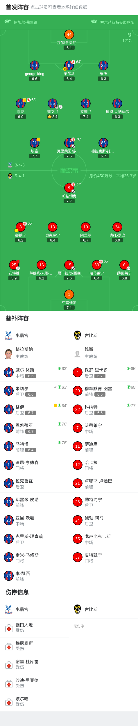 水晶宫2-2十人古比斯,德文尼传射,乌切、帕兹切克、西塞破门,安特维染红