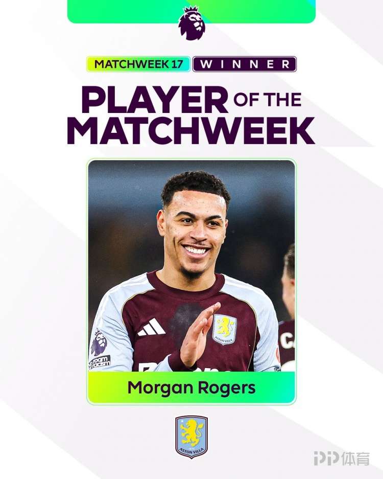 英超官方宣布,罗杰斯当选第17轮比赛最佳球员。