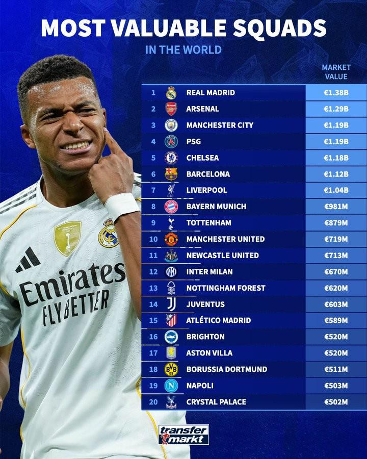 德转列总身价最高球队排名:皇马13.8亿欧居首,阿森纳第二